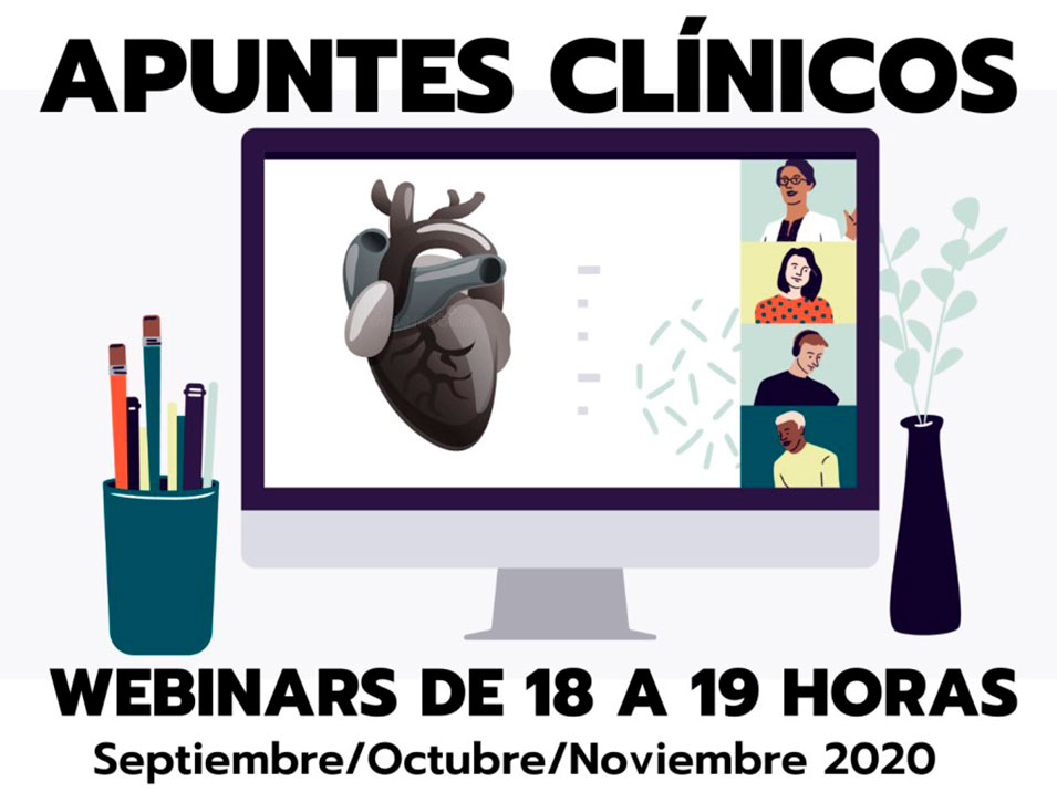 Los días 17 de septiembre; 1, 15 y 22 de octubre; y 12 de noviembre, de 18 a 19 horas, tendrán lugar nuestros 5 webinars ‘Apuntes Clínicos’ dirigidos a médicos de familia, residentes y cardiólogos clínicos. Ya está abierta la inscripción para ponerse el día –vía streaming- en los aspectos más relevantes de la Cardiología Clínica.